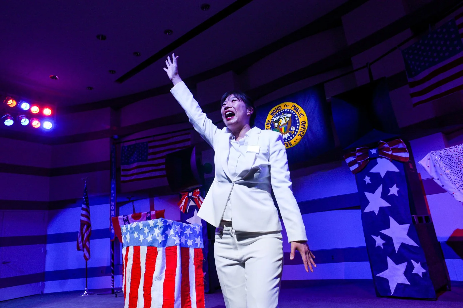 Kristina Wong for Public Office is a comedic performance that crosses the aesthetics of campaign rallies, church revivals, and solo theater shows to tell the story of what it means to run for local office, the history of voting, and the impact artists can have on democracy.